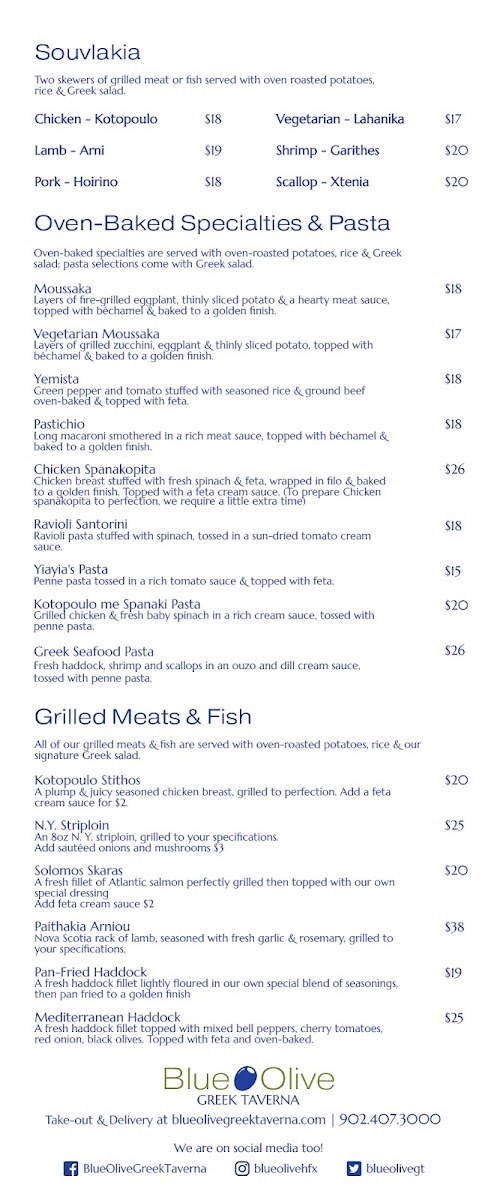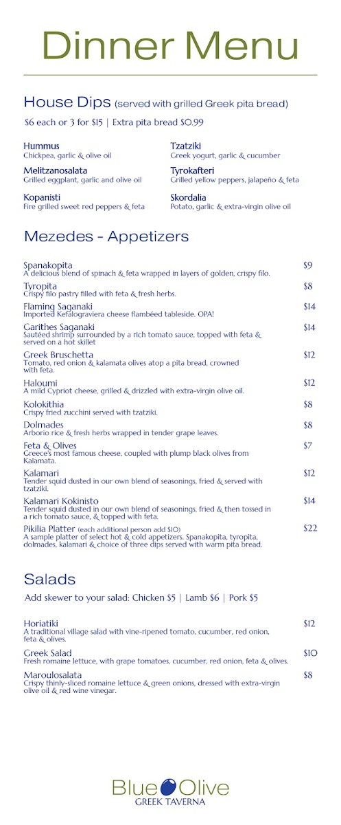 The menu at Blue Olive Greek Taverna offers a balanced selection of traditional Greek dishes served in a relaxed, inviting setting. Whether you're stopping in for a casual lunch, a comforting dinner, or a shared meal with friends and family, the menu reflects the warmth and simplicity of Greek cooking.